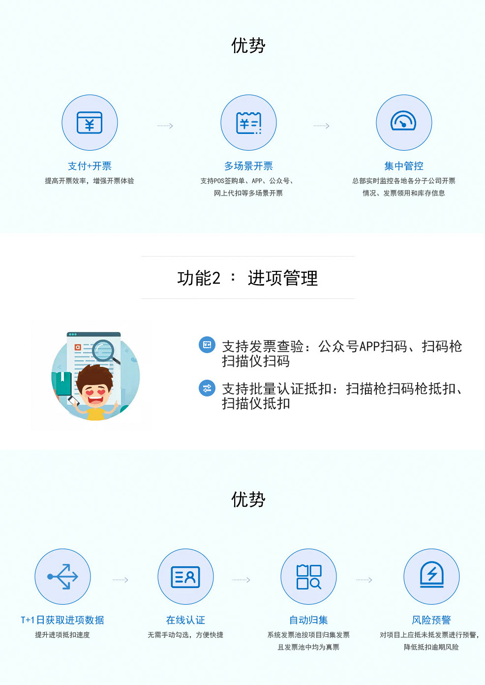 E开票主要功能简化客户开票程序,能一码开票,可叠加于POS小票/平台对接,可定制化开票方案;